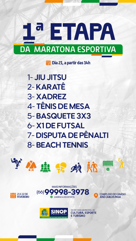 A Prefeitura de Sinop, por meio da Secretaria Municipal de Cultura, Esporte e Turismo, realiza a primeira etapa da Maratona Esportiva de 2026. O evento será sediado no Complexo Esportivo do Ginásio José Carlos Pasa, nos dias 21/2 (a partir das 14h) e 22/2 (a partir das 8h).
