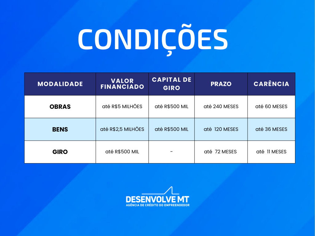 Empresas interessadas podem procurar a Desenvolve MT para mais informações sobre as condições, garantias e documentação necessária. Acesse o site www.desenvolve.mt.gov.br ou ligue para (65) 3613-7900