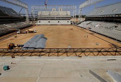 Após a transferência dos dois guindastes que realizavam a montagem dos pórticos da cobertura, a empresa World Sport, com know-how em plantio dos gramados em estádios como o do Pacaembu, Morumbi, Beira Rio, Arena Grêmio e Engenhão, iniciou a movimentação da terra no espaço destinado ao campo de futebol.