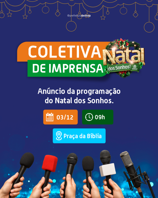 O Natal dos Sonhos, iniciará, oficialmente, no sábado (06). A programação oficial será divulgada em coletiva de imprensa pelo prefeito Roberto Dorner, vice-prefeito Paulinho Abreu e secretário de Cultura, Esporte e Turismo, Gabriel Vasconcelos. A coletiva acontecerá amanhã (03), quarta-feira, na Praça da Bíblia, às 9h.