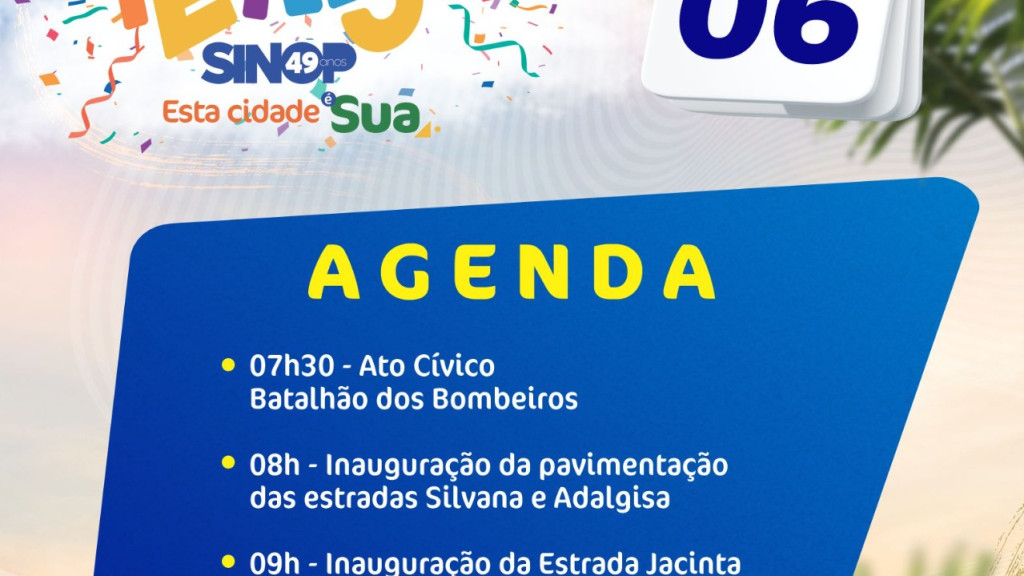 Em continuidade às programações do Festeja Sinop, o prefeito Roberto Dorner inaugura, nesta quarta-feira (6), as obras de pavimentação asfáltica, drenagem de águas pluviais e sinalização das estradas Silvana e Adalgisa, às 8h, e em seguida a obra da estrada Jacinta, às 9h. Foram obras de asfalto muito aguardadas, que agora serão entregues, para garantir mais infraestrutura, qualidade de vida e segurança à população que trafega pela região da Comunidade Nossa Senhora Aparecida e das Chácaras São Cristóvão.